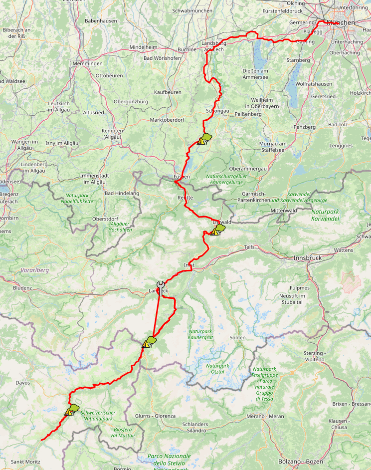 This year’s tour went from From Munich via Claudia to Engadin. First leg goes from Munich to river Lech, then following the Lech until Füssen/Reutte and switching to river Loisach. After the Fern Pass the last river is the Inn.